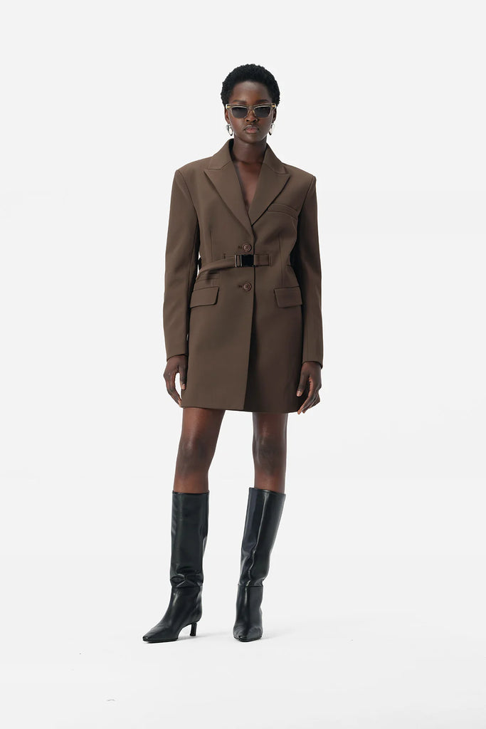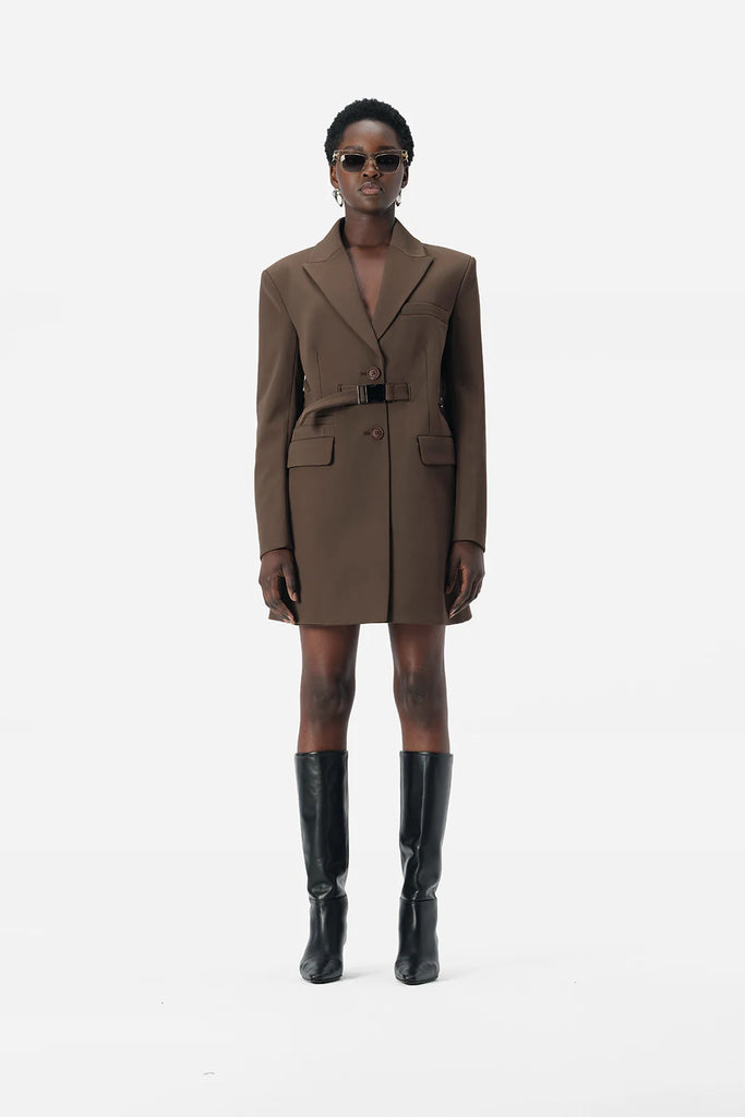 Bringing our signature suiting into new silhouettes, the Dallas Dress incorporates our luxe tailoring into a sleek mini dress silhouette ideal for work or weekend outfitting. Made from a smooth, structured fabric, this mini dress has a sleek silhouette with full length sleeve, collared v-neckline, button through front, and belted waistline. The addition of front pockets plays into the blazer style, perfectly suited for an elevated office look.