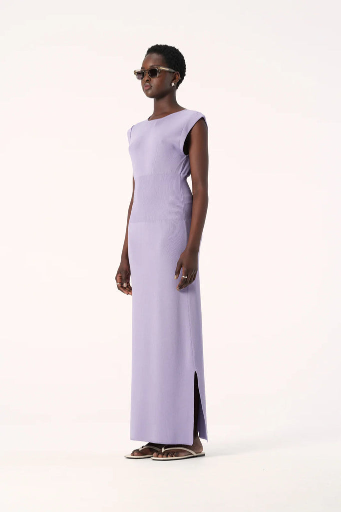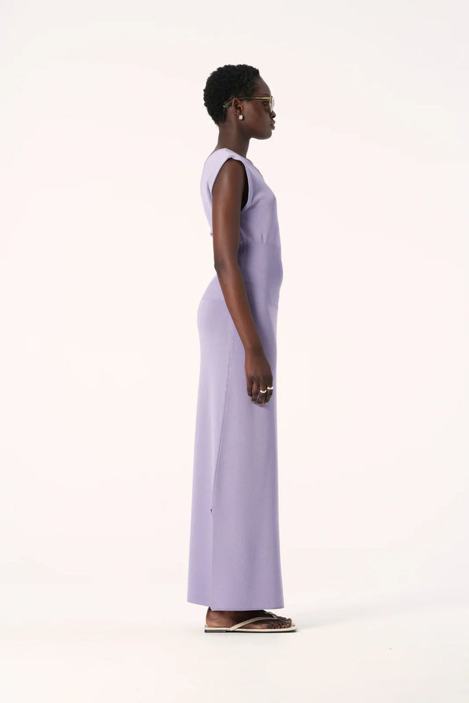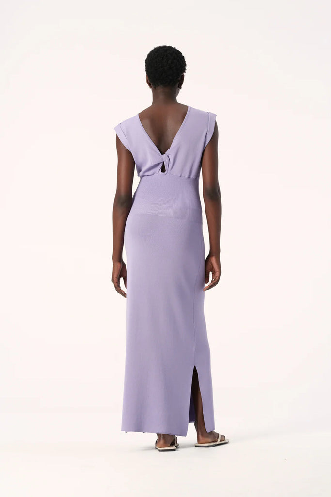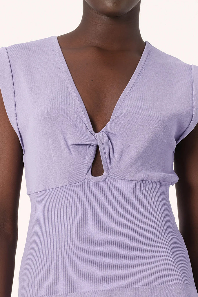 Versatility personified, the Heather Knit Dress in lilac purple is a simple yet elegant statement piece that makes work to weekend outfitting easy. The Heather Dress is crafted from a viscose blended fabric for a soft and stretchy feel and features a sleeveless bodice with a high back and v-neckline accentuated by a twist and cut out detail. A slim fit a-line silhouette with contrasting rib texture at the waistline, the Heather Knit Dress is cut to a midi length with a split at the hem. For a more modest look, wear the Heather Dress backward and layer with an oversized blazer.