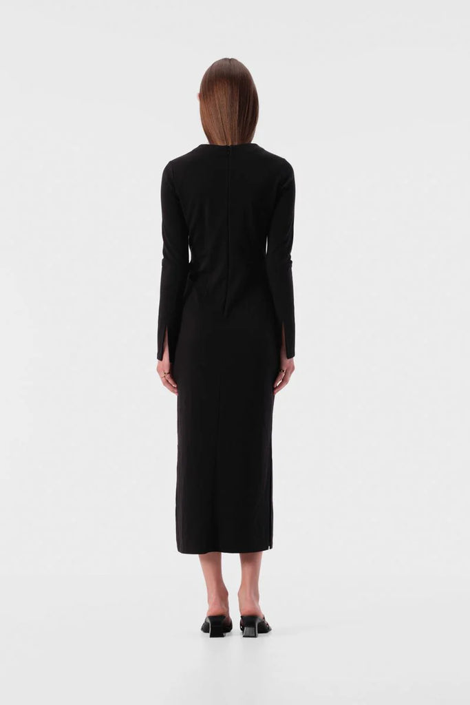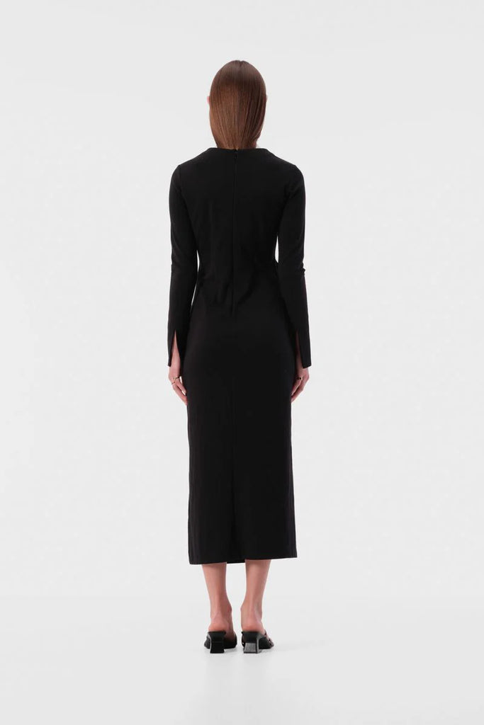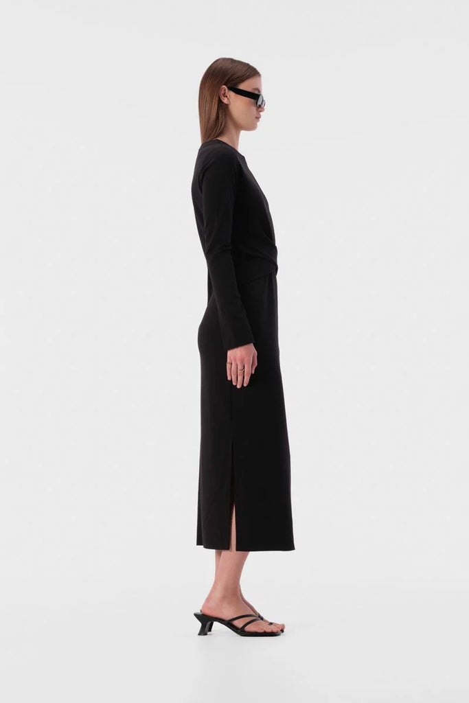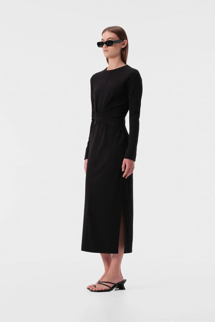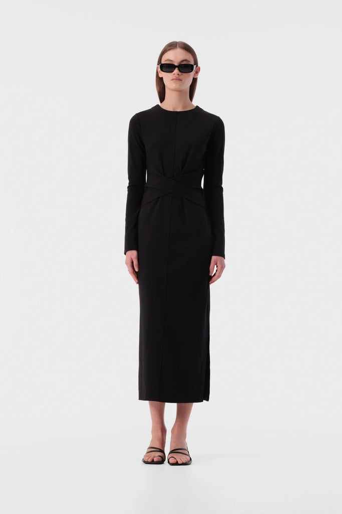 The Rebecka Dress is that essential black dress that every wardrobe needs. It has been cut from a stretch fabric for comfort with flattering cross over detail at the front waist